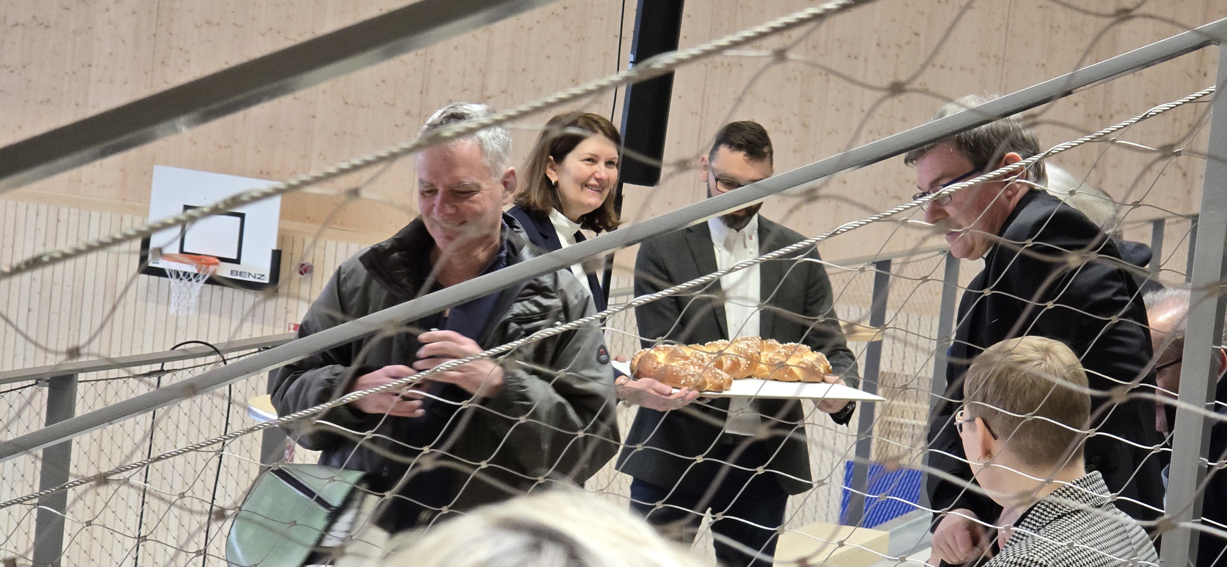 Um 10:30 Uhr hatten sich die geladenen Gäste auf der Zuschauertribüne der neuen Halle eingefunden, darunter Vertreter der ausführenden Baufirma Müllerblaustein, Stadträte, Vertreter der Schulen des danebenliegenden Schulzentrums, Vertreter der Vereine, in der Hauptsache bestehend aus unserem Turnverein, die Landrätin Eva Treu, die Bürgermeisterin Claudia Schäfer-Rudolf, der katholische Pfarrer Waldemar Obrebski und die evangelische Pfarrerin Kathrin Bohe.