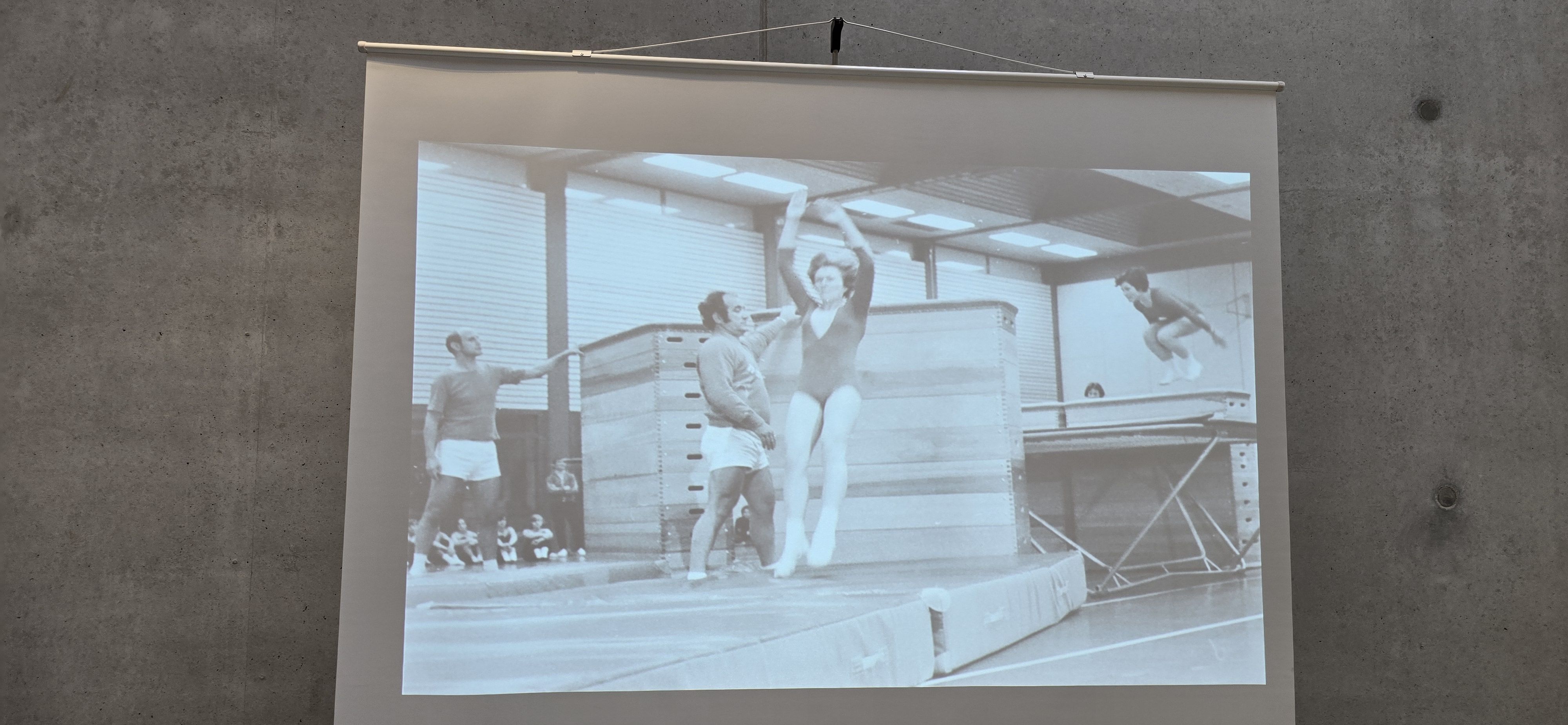 Am Ende des Gangs, von dem man zu den Tribünen gelangt, wurde ein, von der Stadt zusammen gestelltes, Video präsentiert, in dem der eine oder andere in Erinnerungen schwelgen konnte. Darin erfuhr man z.B., dass der Bau der alten 3-fach Turnhalle auch nicht ohne Probleme abgelaufen und für damalige Verhältnisse sicher auch, mit 2,9 Millionen D-Mark, sehr teuer war.